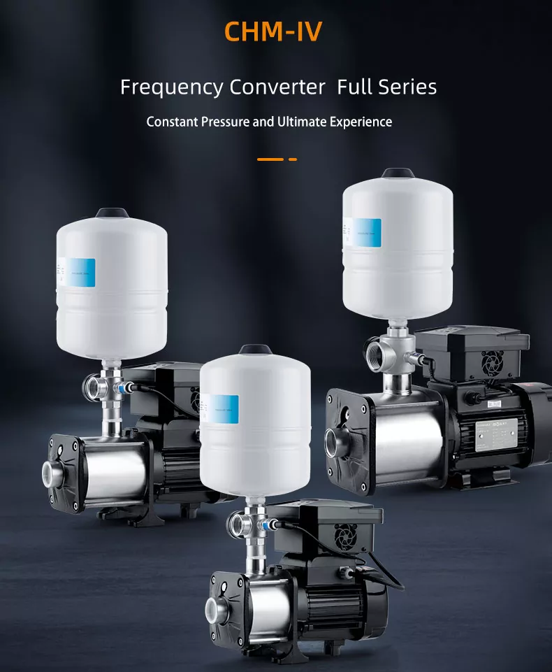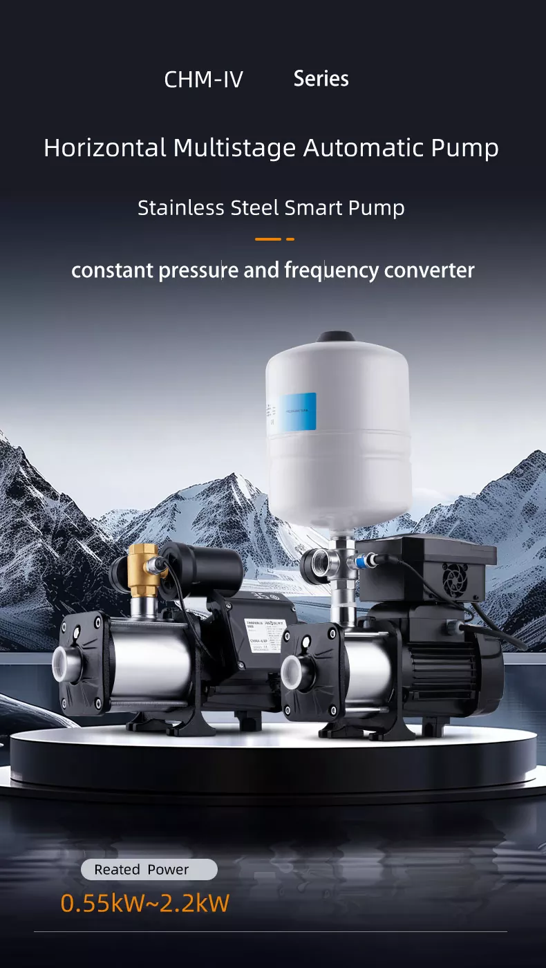 CHM20/IV serijos išmaniųjų keitiklių serijos horizontalus nerūdijančio plieno daugiapakopis išcentrinis siurblys šiuo metu rinkoje yra gana subrendęs produktas, pasižymintis kompaktiška struktūra ir stabiliu darbu, mažu veikimo triukšmu, efektyvumu iki 44–70%. Visi vandenį praleidžiantys komponentai pagaminti iš nerūdijančio plieno AISI304. Jis plačiai naudojamas